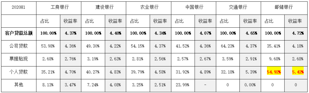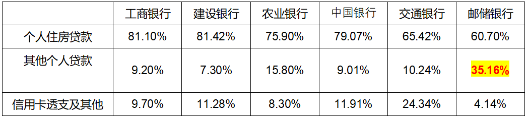 个人贷款的收益率高于公司贷款。邮储银行54%的贷款是投向了个人贷款,高于其他银行20多个百分点,且邮储银行的个人贷款的利率为5.42%,高于传统四大行近60个基点。