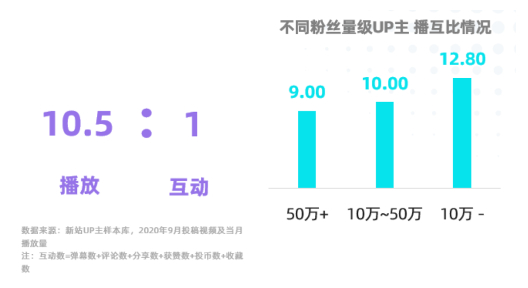 结果显示,B站视频内容「平均每10次播放就会收获一次互动,并且,不同粉丝量级的UP主,播互比表现相差不大。」这或许部分揭示了B站中小UP主也能频繁接到商业合作邀约的原因。