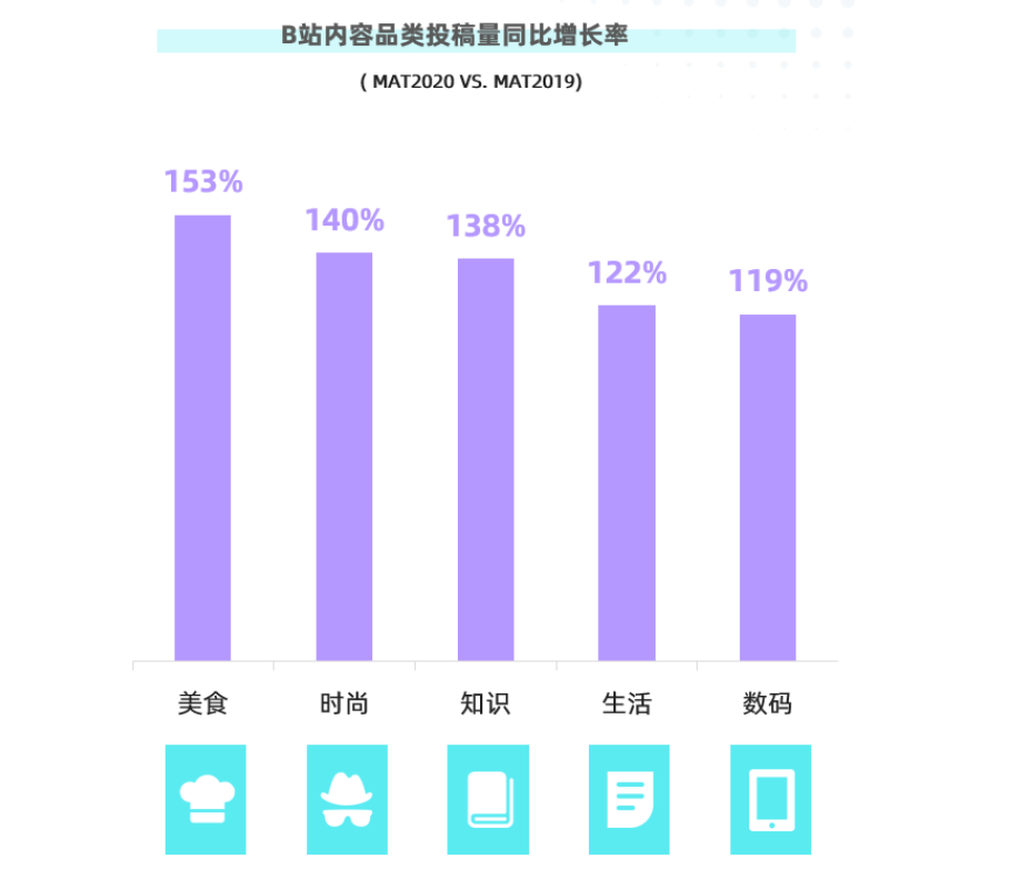 但事实上,在这份数据报告里,却是美食、时尚、知识、生活等泛生活方式类内容投稿量同比增长率要高。其中,美食和时尚以153%和140%的同比增长率位居B站内容品类投稿量同比增长排行之首。