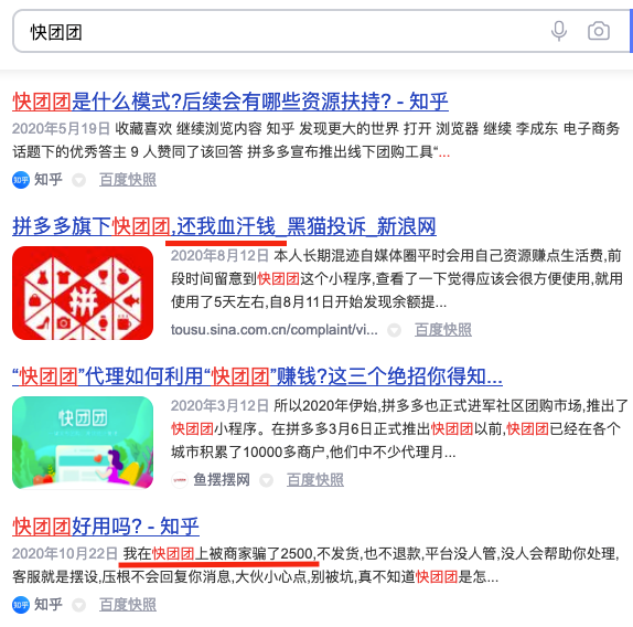 但其热度并未持续太久,几个月后,快团团在社区团购的厮杀中销声匿迹,只留下了很多负面消息。