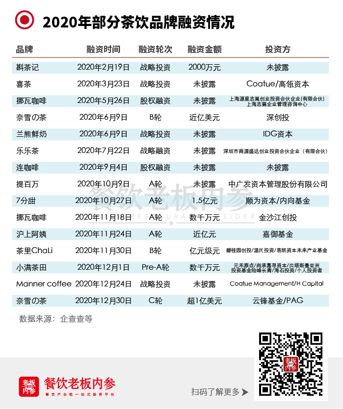 因高度标准化的模式,茶饮向来与资本关系密切。2020年,茶饮赛道一年中大概有15起投资事件,新加入的资本众多,投资金额也在增加,资本是有效资源,让企业更有效率,借助资本力量扩规模。