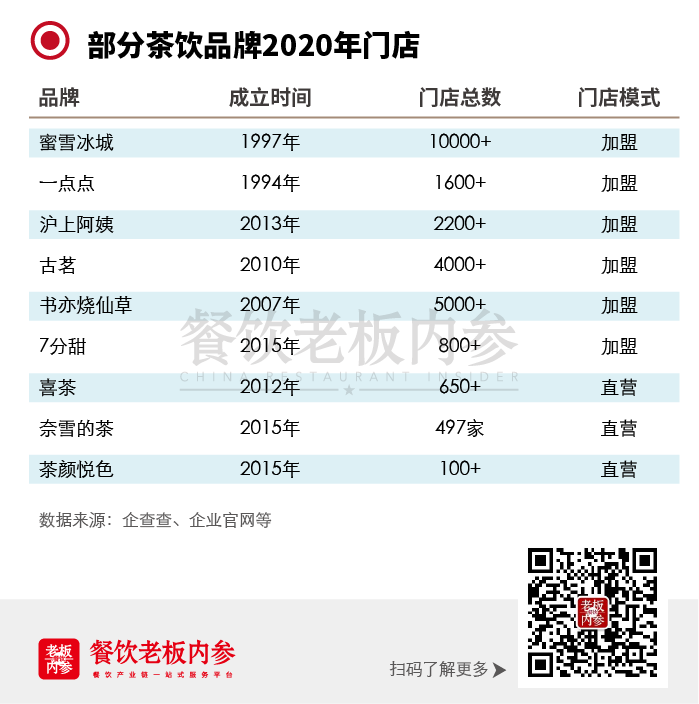 在一二线城市,喜茶、奈雪的茶等品牌地位稳固,平均每年以80-100家直营门店增加;而蜜雪冰城、书亦烧仙草、沪上阿姨等从二、三线城市崛起的品牌浮出水面,以加盟模式迅速扩张,蜜雪突破万家门店,书亦、沪上阿姨则以每年开近400加盟店的速度在全国布局,快速抢占市场。