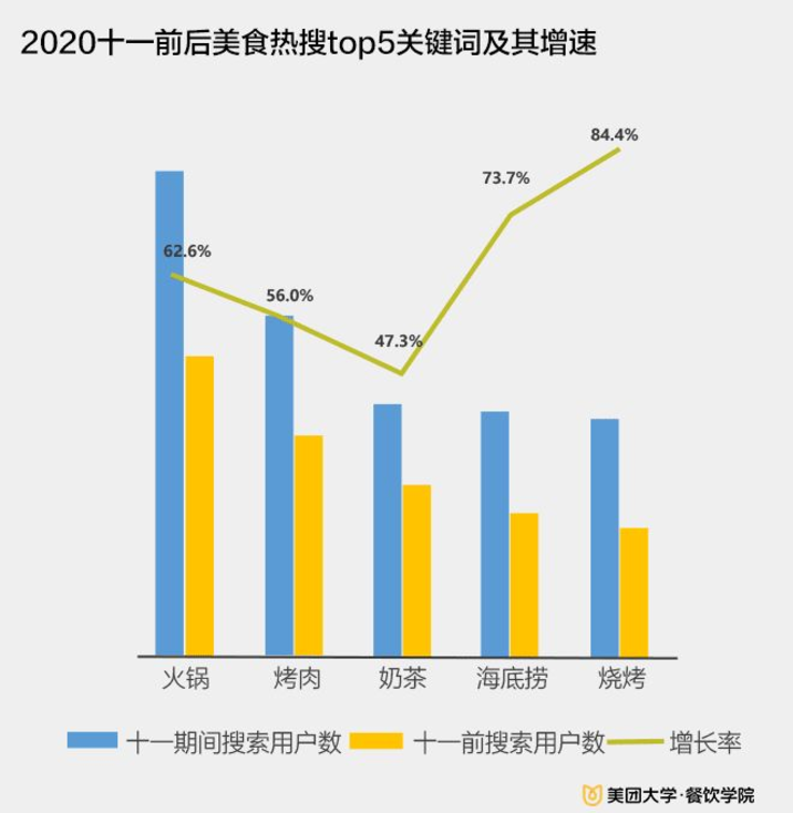 烤肉成为搜索黑马,与疫情紧密相关。人们的报复性消费明显,火锅、奶茶、烧烤成为最受欢迎品类;同时,疫情也让人们在饮食上更重视安全卫生,不仅要吃得好,还要吃得健康。