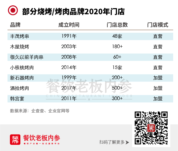 烧烤是大品类、大赛道,但无大巨头。直营品牌尚无破200家的品牌诞生,其中木屋烧烤在2020年达到180+门店,同比2019年新增50多家。
