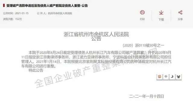 2021年1月14日,杭州市余杭区人民法院根据出资人北京紫荆聚拢科技投资有限公司的申请裁定,正式对长江汽车有限公司(下文简称“长江汽车”)进行重整。
