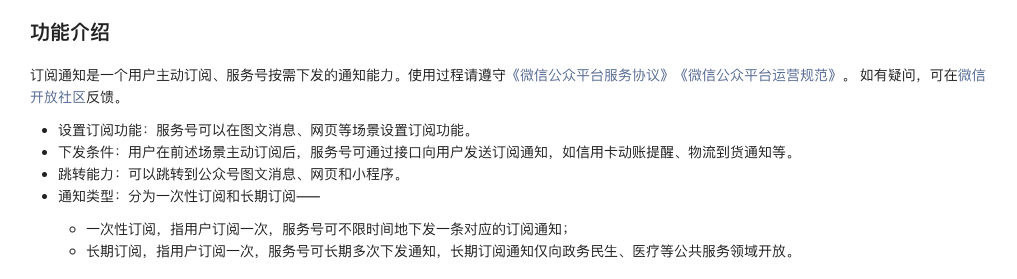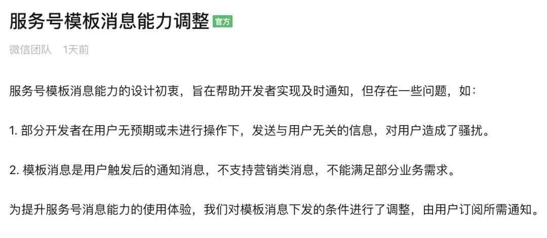 模板消息作为服务号一项元老级能力,其历史可以追溯到 2016 年。为了弥补服务号推文群发次数过少的问题,微信团队赋予了服务号实时定向推送的能力:“模板消息仅用于公众号向用户发送重要的服务通知,只能用于符合其要求的服务场景中,如信用卡刷卡通知,商品购买成功通知等。不支持广告等营销类消息以及其它所有可能对用户造成骚扰的消息。”