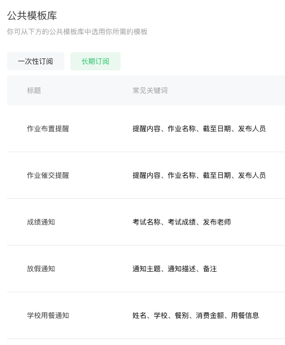 根据开发文档我们可以得知,长期订阅通知仅向政务民生、医疗等公共服务领域开放。经过测试,教育信息服务类目下也可以使用长期订阅能力,只是这些模板主要以线下教育为主,众多在线教育企业并不太适用。