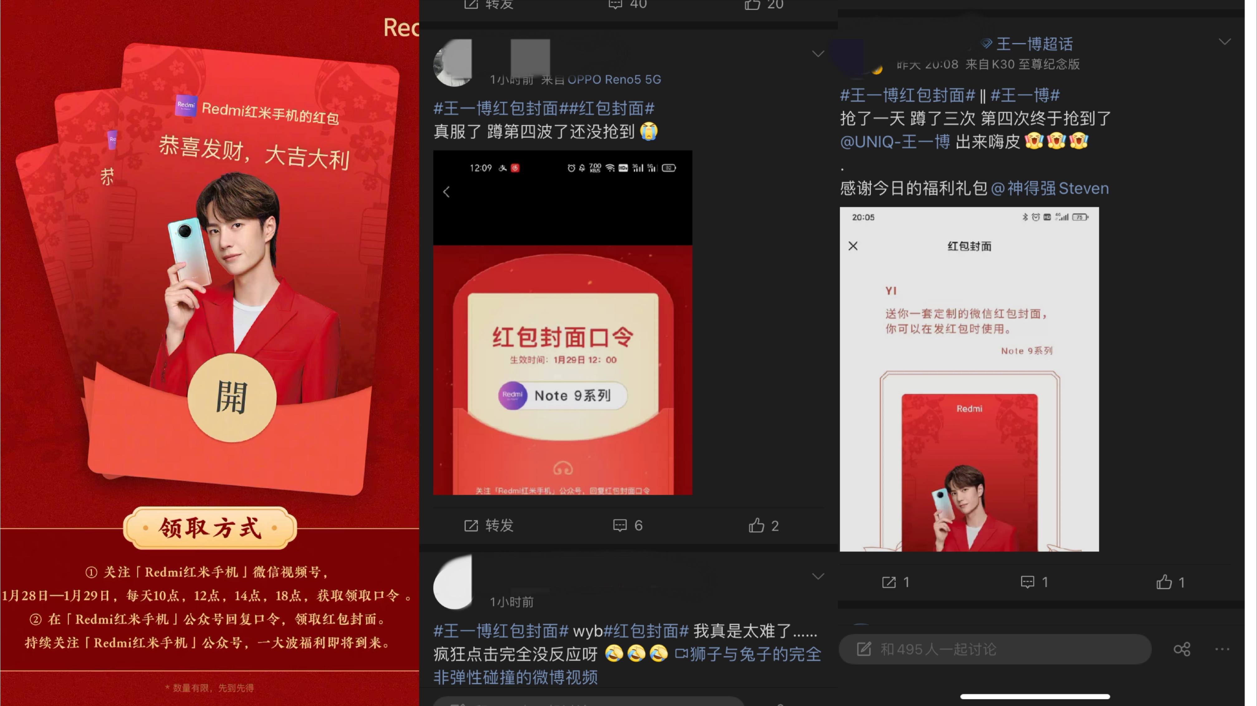在微博上,王一博超话有粉丝分享抢红包封面经历,有人定闹钟在红米视频号蹲守口令,很多人抱怨“陪跑”三四波(指参与三四轮抽奖)仍然抽不中。
