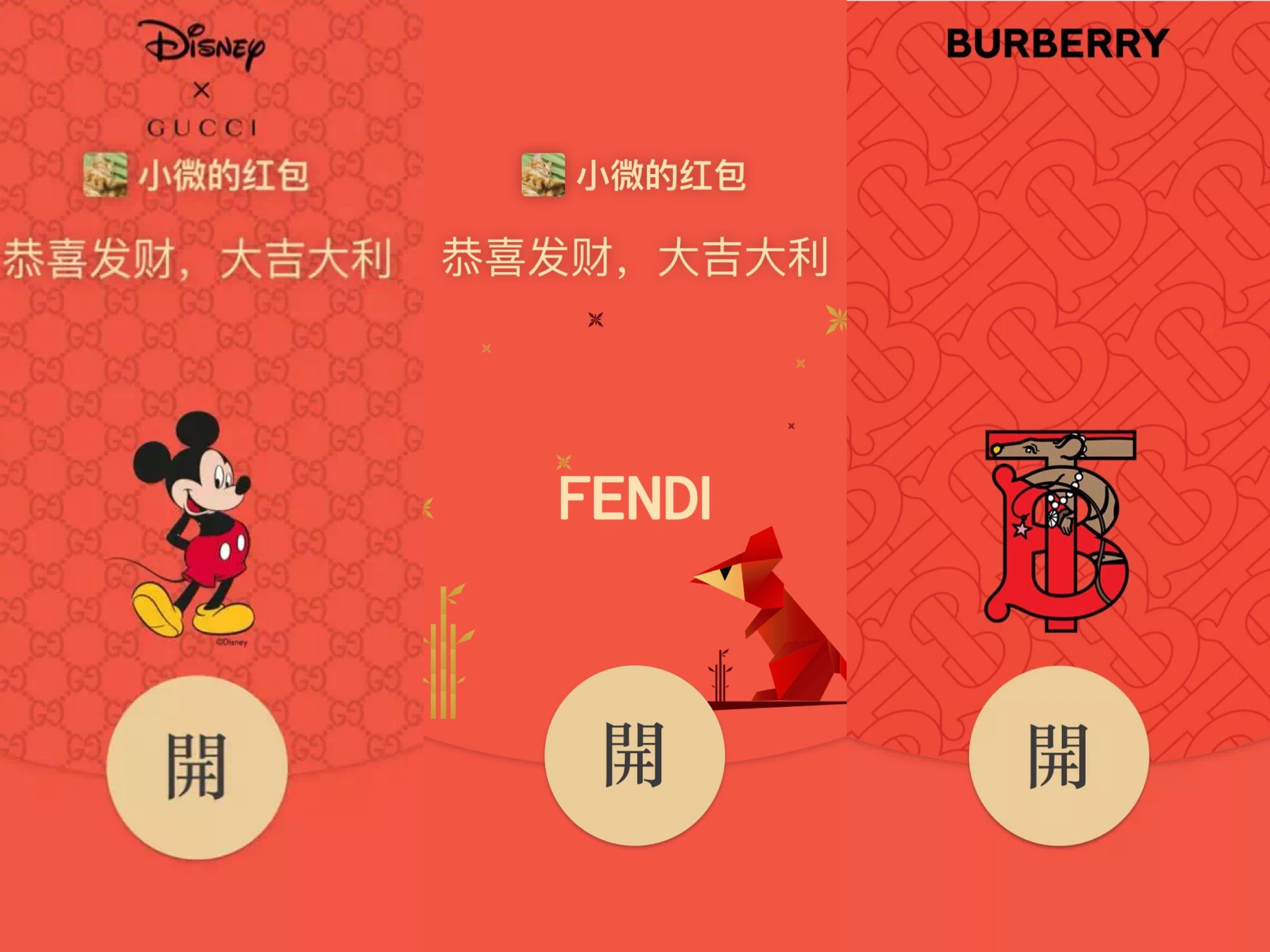 从左至右:Gucci、Fendi、Burberry 在 2020 年春节定制的红包封面