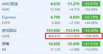 一套组合拳下来,GME等股票坐上火箭一般的飙涨势头被硬生生掐断了。周三盘后,一夜暴涨300%的AMC院线跌超40%,GME跌超26%,Express跌超37%,黑莓跌近27%。