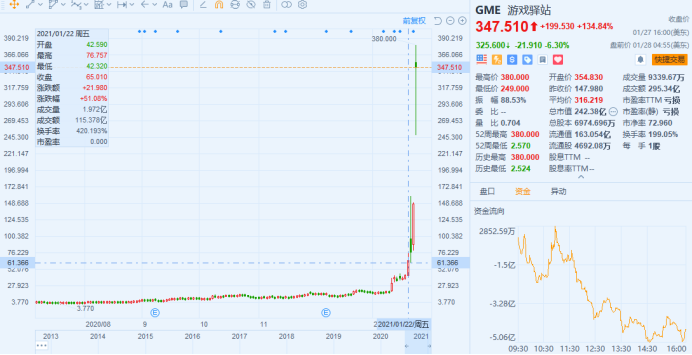 巨大利益面前,散户们的热情彻底爆发,开始新一轮的疯狂购买看涨期权。本周,GME股价来了个三连跳,周一收盘股价还不到80美元,周二几乎翻倍到150,到周三,直接飙到最高380美元!3天,GME涨了430%。