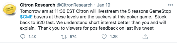 另一方面,由于GME股价不跌反涨,做市商不得不一直购买股票来对冲期权产生的做空敞口。与打了鸡血的散户形成了一股更强的推高GME股价的合力。空头们终于撑不住了,香橼宣布“停战”,表示将不再就 GameStop 发表意见。