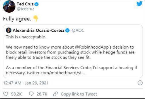 美国券商的不道德行为正在遭受全民指责,Robinhood的应用评分跌到谷底,甚至引发集体诉讼。另外,一众民主党、共和党的议员也达成一致,批评这一不公平的行为:你们这样搞,置华盛顿于何地、置麦迪逊于何地、置纽约海港上的自由女神像于何地?