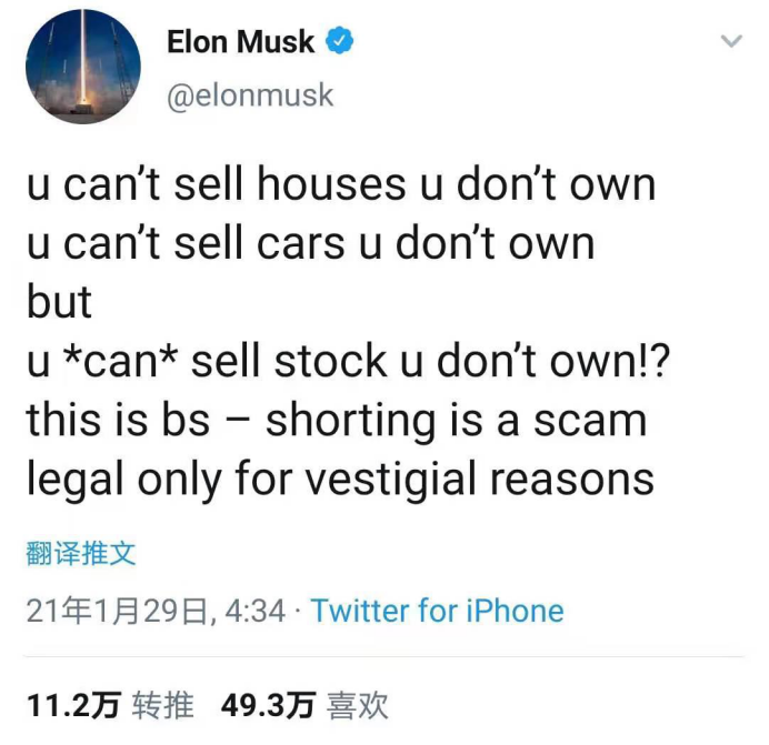 早就有人对此不满。马斯克在2019年12月就呼吁将卖空行为视为“非法”活动,这几天更是借着战势胶着不断带节奏,抨击华尔街的空头们都是大骗子。