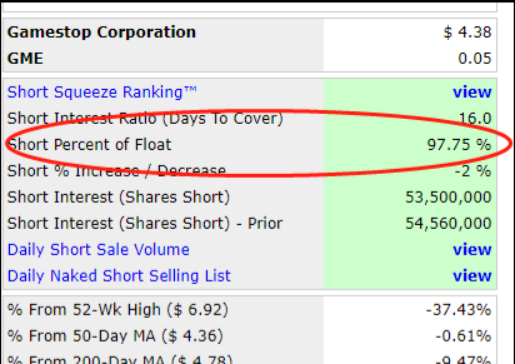 华尔街的做空者们嚣张到了什么地步?2020年,GME流通股做空率一度超过了90%。截至目前,GME已经被做空了140%!这太疯狂了,GME毫无疑问成为美股市场上被卖空最多的公司。