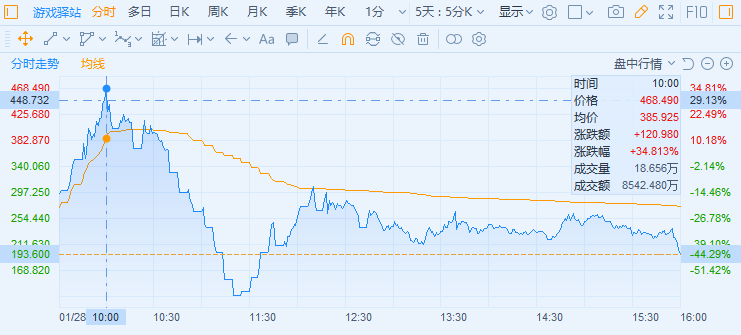 这招釜底抽薪的确够狠,对冲基金不受限制,散户的交易通道却几乎全被封死。涨到一半的GME果然应声跳水。截至收盘,AMC和Express跌超50%,黑莓跌超40%。GME大跌44%,股价从将近500美元直接腰斩,收盘价不到200美元。