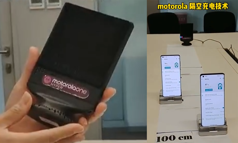 ▲左:摩托罗拉隔空充电发射器,右:摩托罗拉隔空充电方案展示