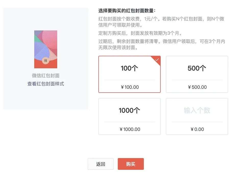 根据微信官方的定价,红包封面按个数收费,100个起订。此前未全面放开时,收费标准为10元/个。随着去年底正式支持个人创作者定制专属红包封面,价格降至1元/个。