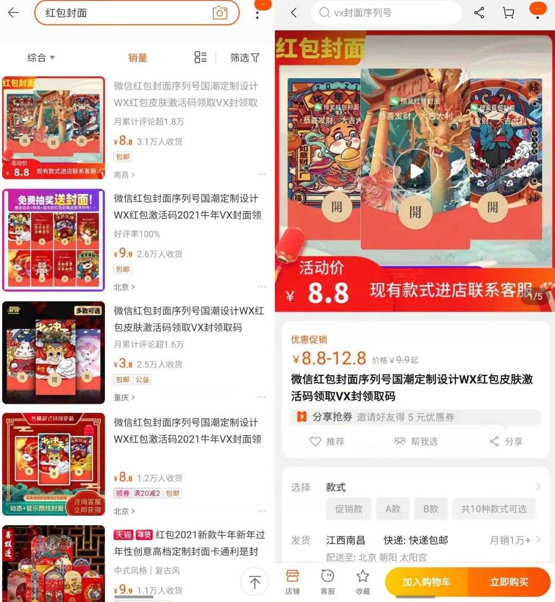 以淘宝商家为例,搜索“红包封面”,按销量排序,排在第一位的商品定价分为8.8元、9.9元、12.9元三档。销量方面,其月销已经达到1万+,总付款人数超4.8万。简单计算可知,仅凭这一个商品链接,商家便能月入十万。