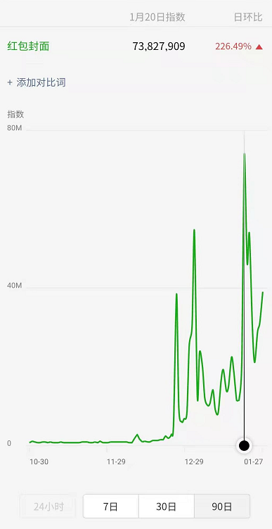 据微信指数统计,最近一个月“红包封面”的搜索指数较此前出现了显著波动。例如,2020年12月25日、2021年1月1日、1月20日这三天,其指数分别达到了3840万、5456万、7382万。而在此之前,这一数字长期保持在百万以内。