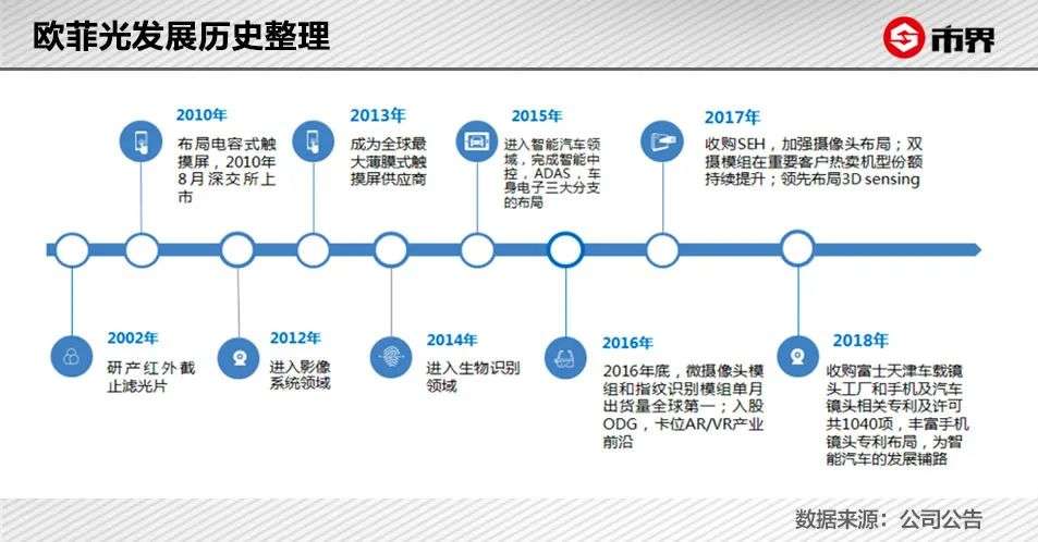 这之前,欧菲光依次踩中了红外截止滤光片、触控显示、摄像头和指纹识别几个重要风口,依托自己积累的客户基础,同时采取并购的方式整合资源、加强实力,才有了一定的成绩。