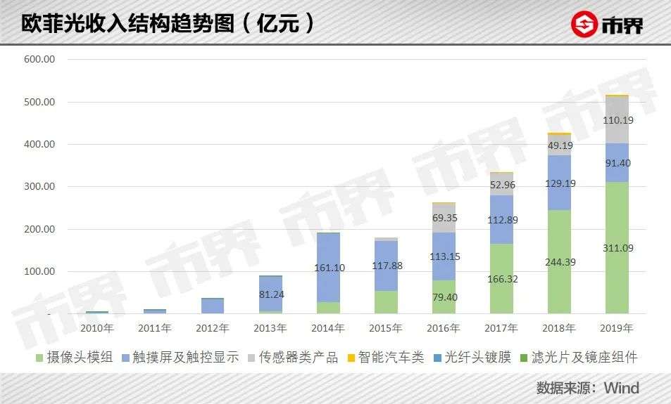 根据2019年的年报信息,欧菲光的业务可以大致分成四大块,分别是摄像头、触控显示、传感器和智能汽车。