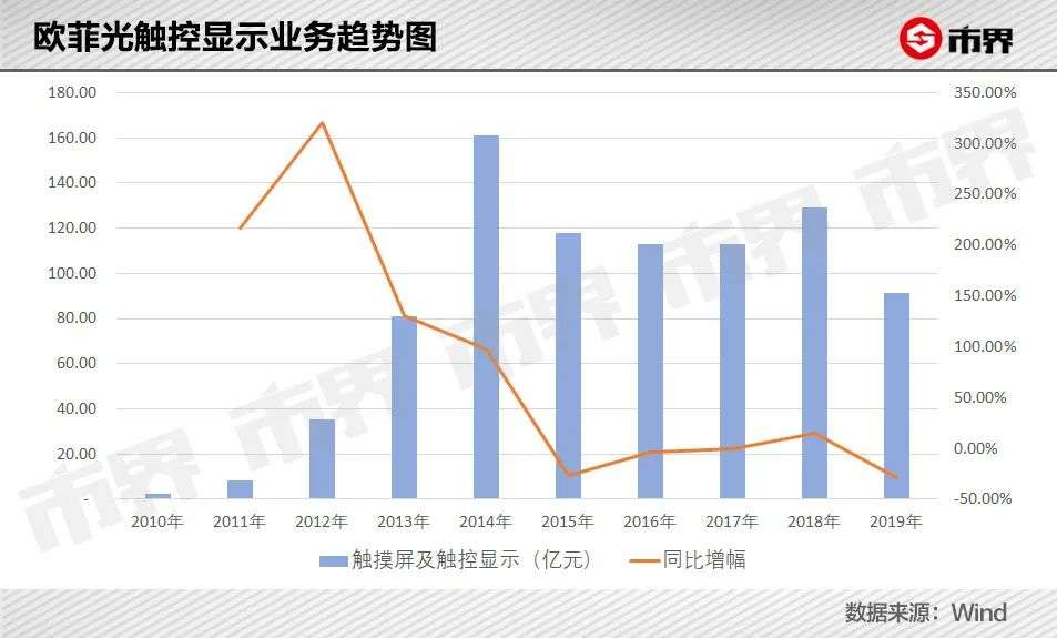 技术上的落后,导致欧菲光的触控显示业务在2014年达到161.1亿元收入后,就基本上不再有明显的增长。