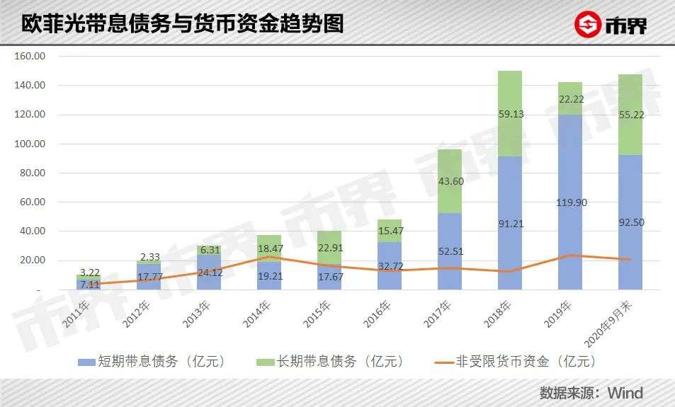 2020年9月末欧菲光可用货币资金只有20.77亿元,但一年内到期的带息债务有92.5亿元,两者之间的缺口高达71.73亿元。