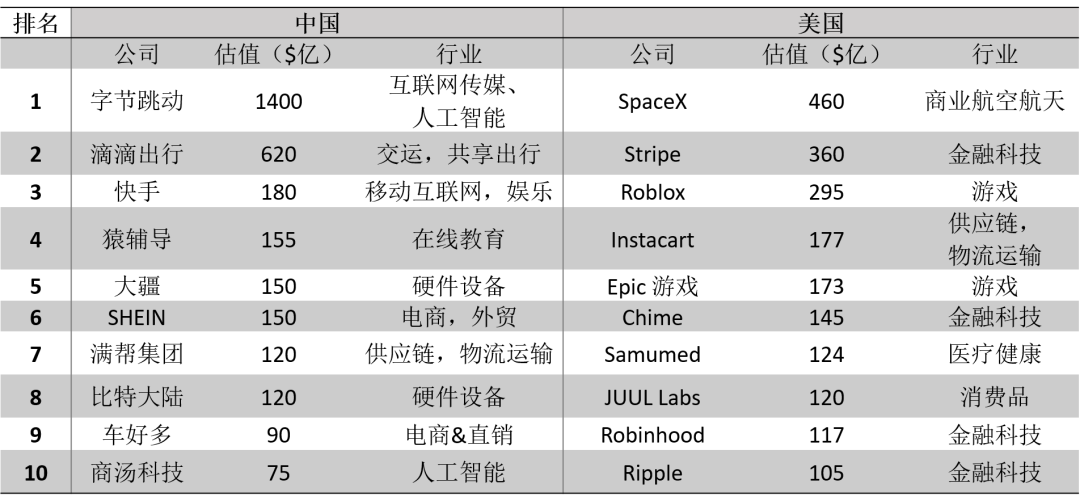 表 5 中美前十独角兽对比