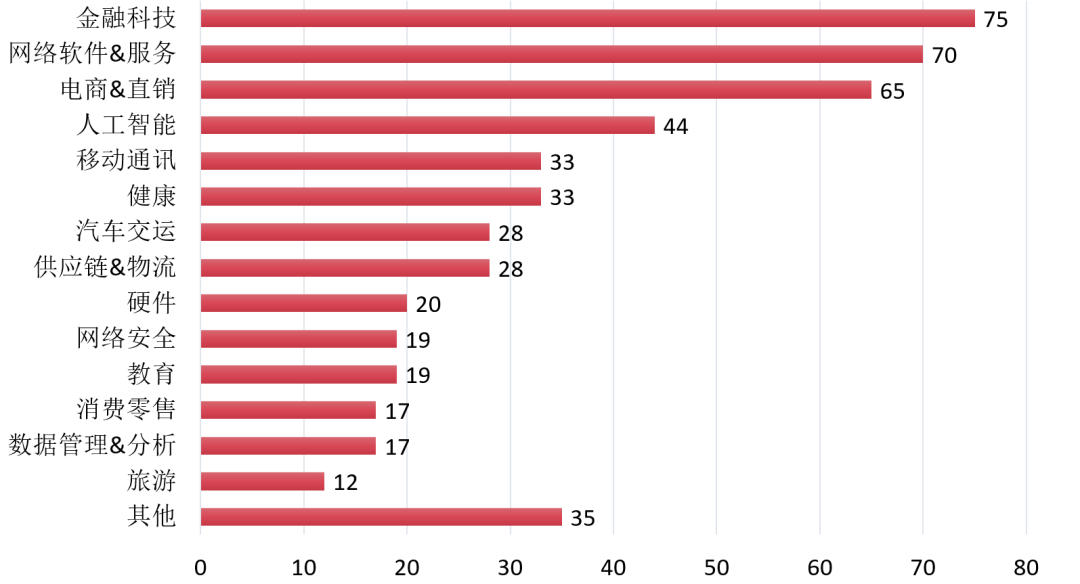 独角兽企业的行业分布上,独角兽分布在15个细分行业中。金融科技为最热门的领域,涌现了75家独角兽,互联网软件服务有70家公司上榜,电商直销有65家公司上榜(图 3)。