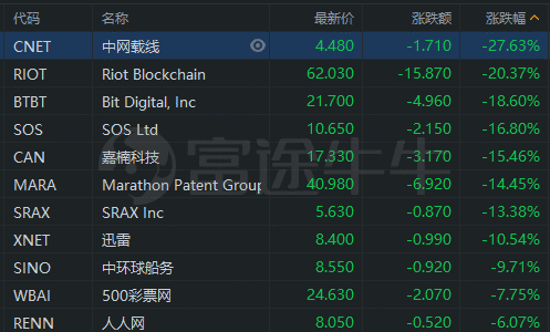 $中网载线(CNET.US)$、$嘉楠科技(CAN.US)$、$迅雷(XNET.US)$等区块链概念股普遍下跌,不过第九城市涨近4%,亿邦国际涨超7%。
