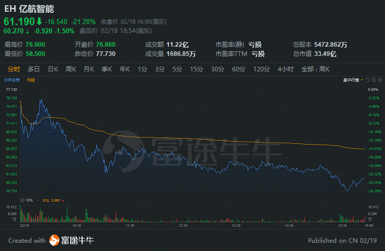 亿航智能低开低走,重挫21%,领跌热门中概股;