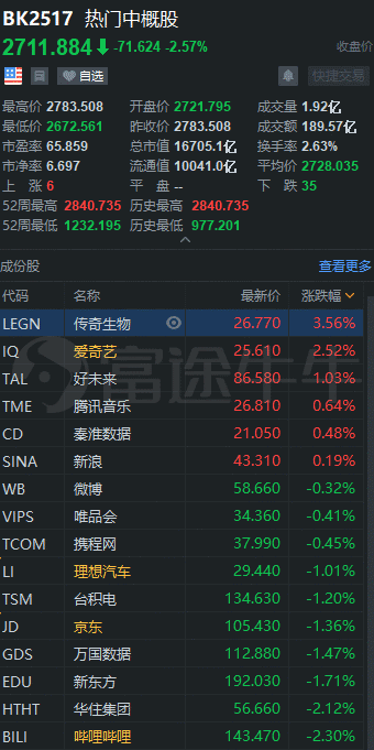 知名中概股中:阿里跌2.33%;百度跌3.46%;京东跌1.36%;网易跌2.03%;新浪涨0.19%;新浪微博跌0.32%;拼多多跌3.47%;蔚来跌5.04%;小鹏汽车跌5.21%;理想汽车跌1.01%;爱奇艺涨2.52%;