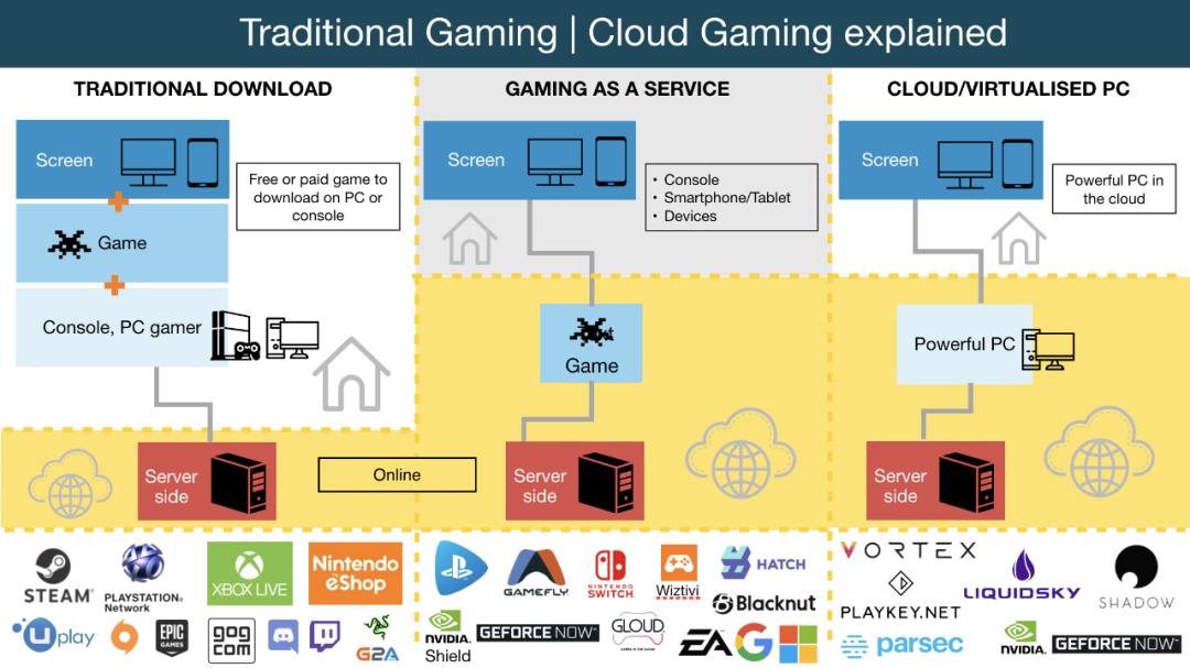 我们还提到了在游戏社交化的趋势下,如今的游戏已不再是玩家只进行一次性购买的消耗品,而是成为了“游戏即服务”- 可持续升级的云端平台。随着视频流媒体赛场火热,人们玩游戏也想更加“随时随地、随时升级”,云游戏的出现便是这一需求的解答。