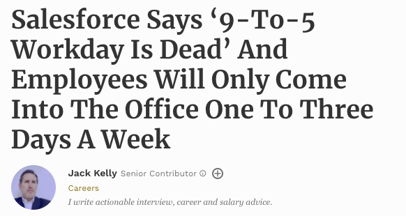 “朝九晚五的模式已经彻底死了。”Salesforce本周在一封发送给全公司员工的邮件中表示将重大改革未来上班模式。