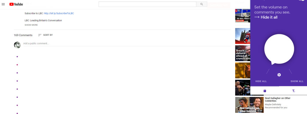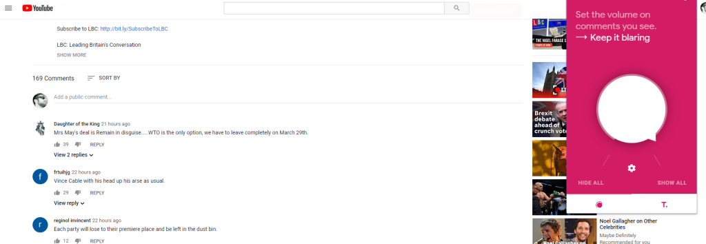 当Jigsaw有害评论过滤器处于“full volume”时,用户可看见全部有害评论。