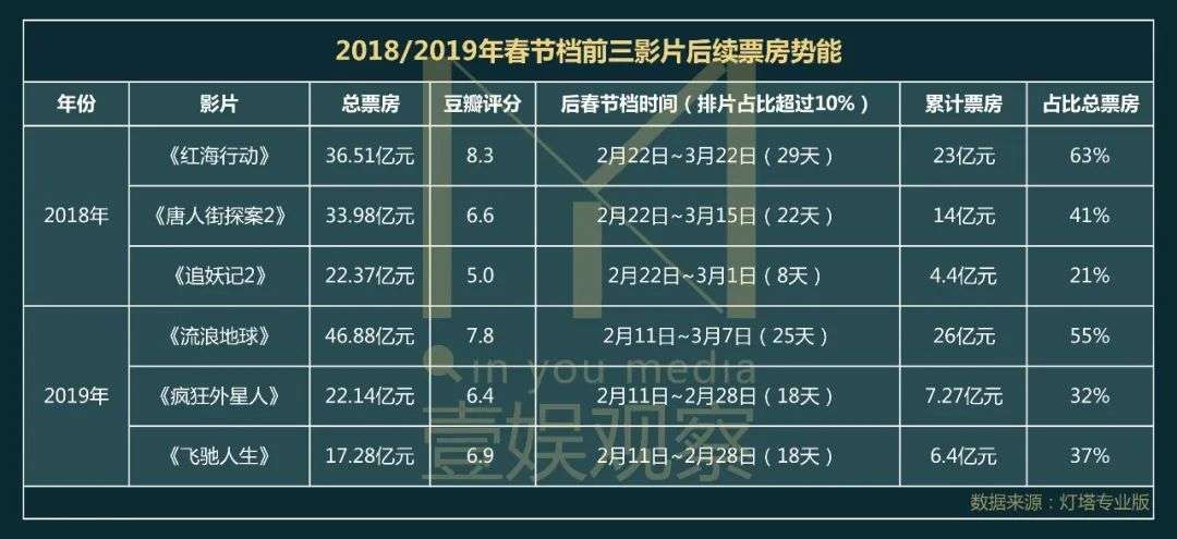 通过壹娱观察(ID:yiyuguancha)的整理,2018年和2019年春节档前三甲影片的后春节档票房信息如下图所示,高口碑档期冠军《红海行动》《流浪地球》的确还会拥有近一个月的时间票房发酵。