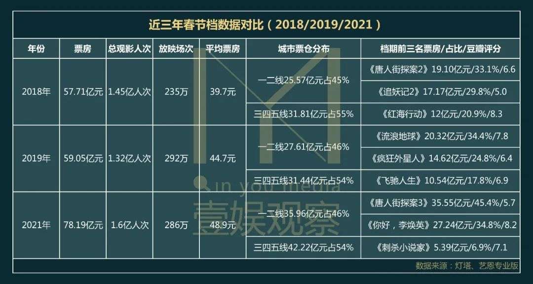 壹娱观察(ID:yiyuguancha)整理了三年(2018/2019/2021年)春节档数据,通过图表可以直观看出,2021年春节档在档期各项数据都得到了显著提升,并将春节档期的潜力进一步挖掘。