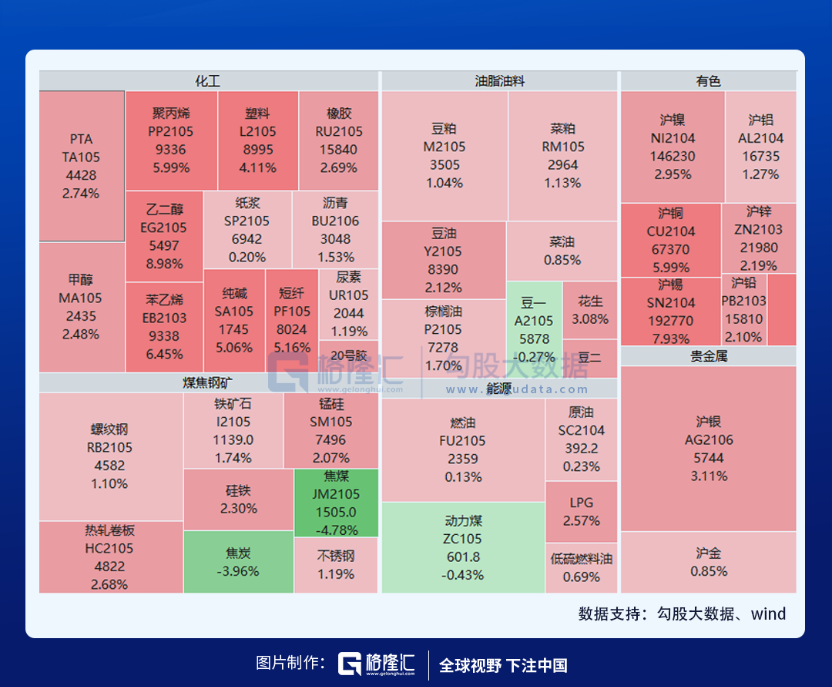 不仅是股市的盛宴,期货市场上,今天有色金属、能化品延续强势,国际铜收获上市以来首个涨停,沪锡、沪铜等开盘直接飙至涨停: