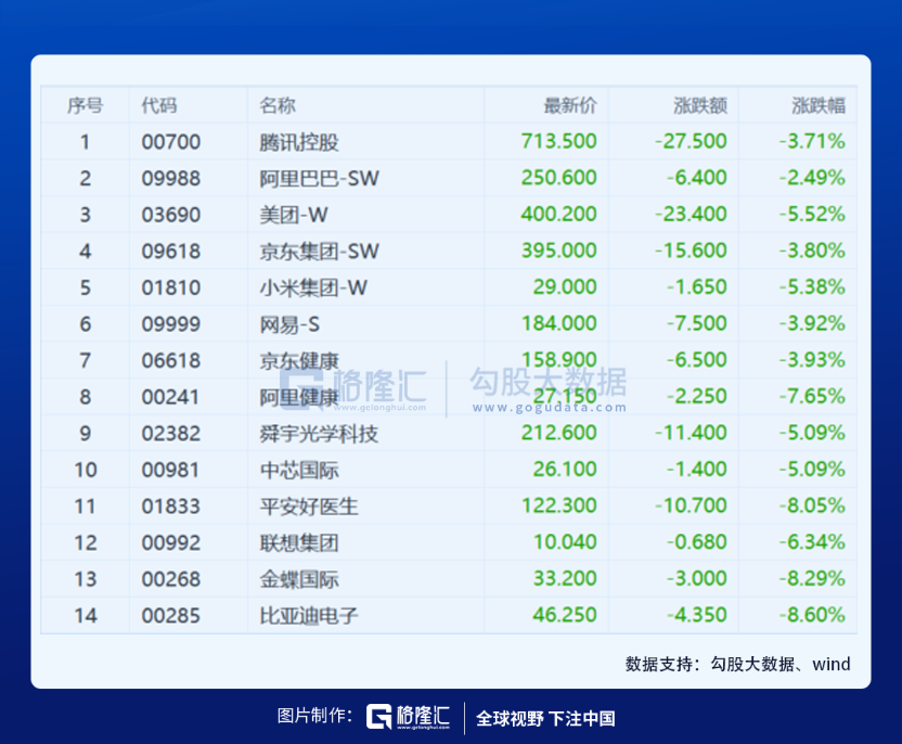 不仅是A股,香港的核心抱团股也同样未能幸免。虽然恒指收跌1%幅度不大,但恒生科技指数大跌了5.53%,前期被抱着往上冲的核心资产纷纷重挫,美团、小米跌超5%,腾讯、京东跌近4%,阿里健康、平安好医生、金蝶国家、比亚迪电子等更是跌到了8%左右。