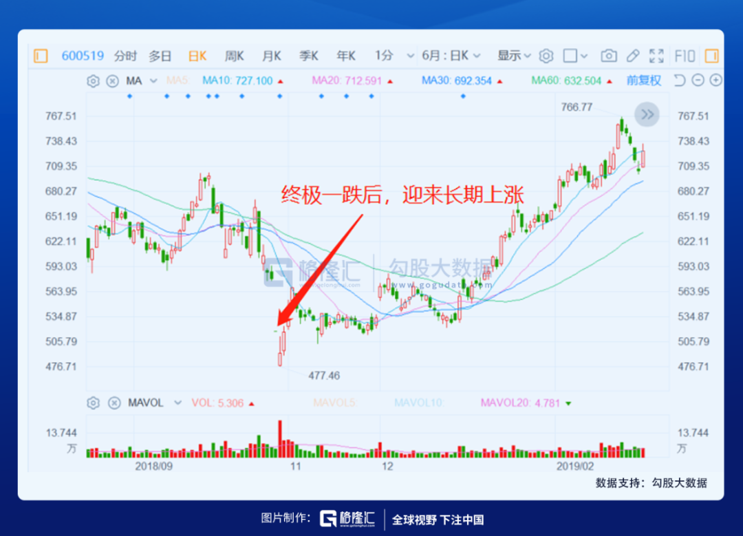那时候的茅台,股价差点跌破500元,市盈率只有不到21倍。但没想到,茅台的终极一跌,反而成了市场见底的一个信号,很快市场重新开启新一轮强势上涨。