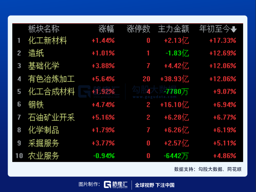 同时有色股也带动起整个周期概念,包括钢铁、煤炭、石油、化工、造纸甚至传统基建等在近几个交易日周期股都涨势持续强劲。