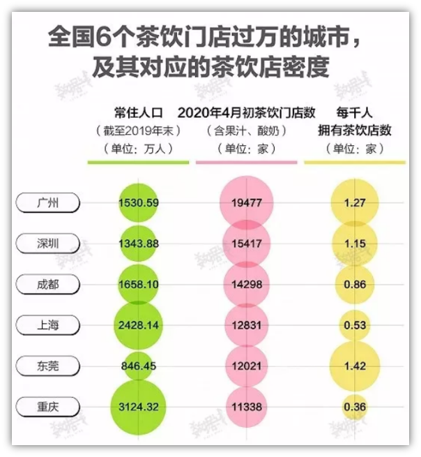 2019年,新茶饮市场早已一片红海,华南地区更是“重灾区”。据相关数据显示,截止到2020年,王老吉凉茶的大本营——广州市拥有19477家奶茶店,全国第一;每千人拥有奶茶店为1.27,全国第一;在6个茶饮门店过万的城市中,华南就占2个。1828王老吉草本新茶在一片深红海中游泳,生存难度可想而知。