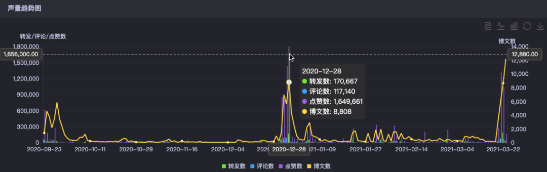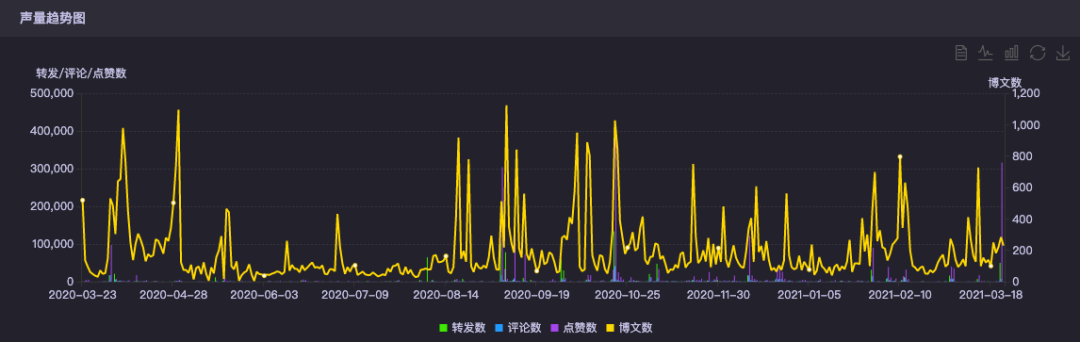 根据时趣洞察引擎,2020.9.23-2021.3.22区间监测,“杨笠”的社交声量趋势图,呈现明显的“事件性峰值”,比如上图中第一个低峰值,时间点分别为《吐槽大会》播出后,杨笠在社交媒体发文称“不想当小公主,就相当老富婆。”另外两个高峰值分别为,杨笠代言英特尔和杨笠站台宝洁电商直播。可以看出,杨笠在个人影响力上极具爆发性,但话题热度持续性不稳定。