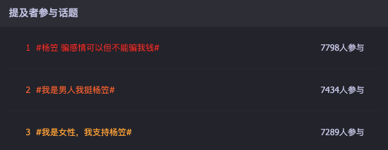 在刻板印象里,杨笠作为“女性”的代言人,经常言辞犀利遭到男性反感,其粉丝应该绝大部分为女性。而数据显示,在杨笠的粉丝中有四分之一其实为男性用户,并且#我是男人我挺杨笠#的话题也占据提及者参与话题榜Top 2。