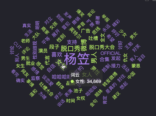 最后,从提及“杨笠”的内容高频词云可以看出,“女性”、“男性”、“女人”、“男人”等性别议题仍是被用户关注的重点。一方面,想要着手「性别议题」打开女性市场声量的品牌,可以考虑与杨笠合作;另一方面,男性用户占主体的品牌与杨笠合作要慎重。