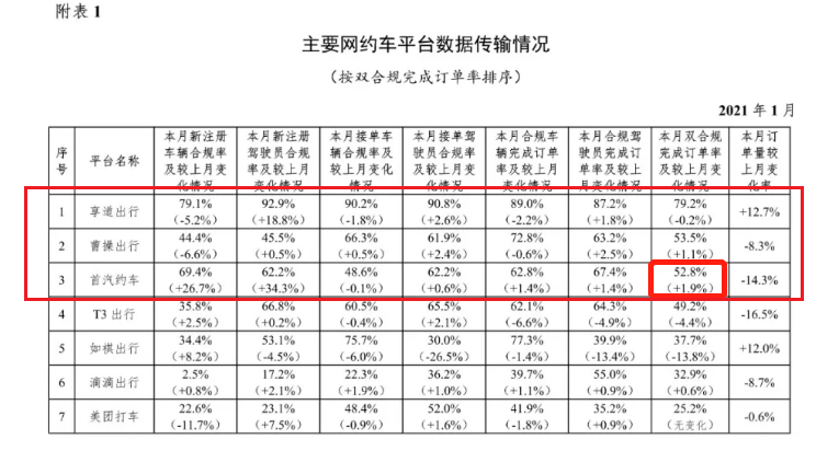 交通运输部公布的2021年1月主要网约车平台数据传输情况表格显示:首汽约车双合规完成订单率已连续数月徘徊在50%上下,已经开始逐渐落后同一赛道的享道出行和曹操出行。