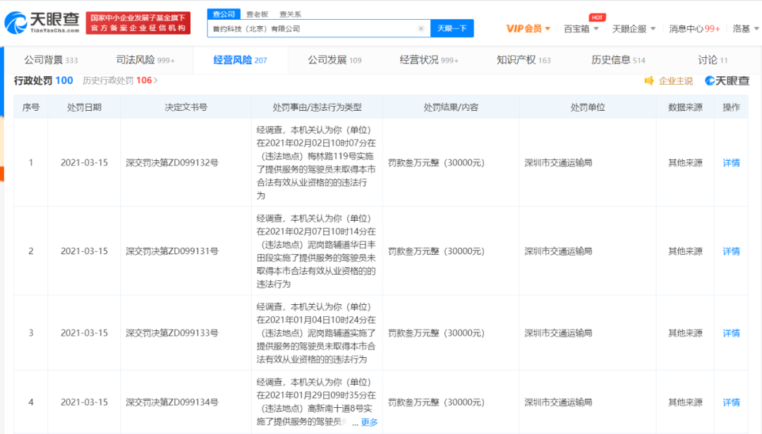浏览深圳市交通运输局官网最新公示的行政处罚信息可以发现,今年以来,深圳市交通运输局共查处4起首汽约车提供服务的驾驶员未取得该市合法有效从业资格的违法行为,深圳市交通运输局对上述4起违法行为分别罚款3万元,共计12万元。