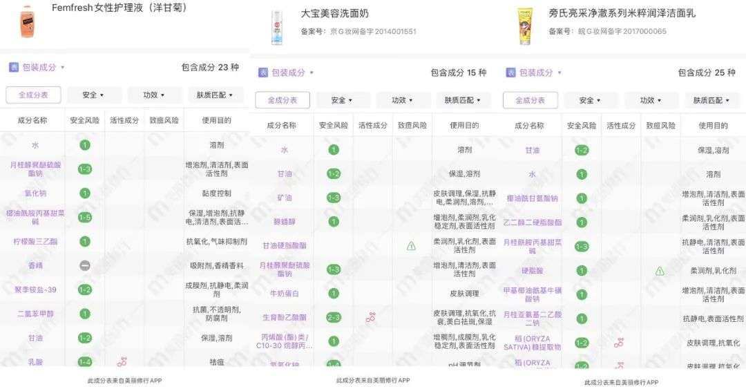 女性护理液和洗面奶成分的对比图,来源:美丽修行App