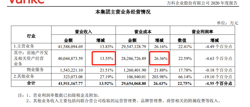 毛利率的背后是成本与利润的微妙关系。但很显然,万科在主营业务以及其他业务营业成本的增幅要大于营业收入的增幅。单独拿出万科房地产开发及相关资产经营业务的数据来看,2020年利润增加了477亿,但成本也增加了590亿,两相抵消反而少赚了一百多个亿。